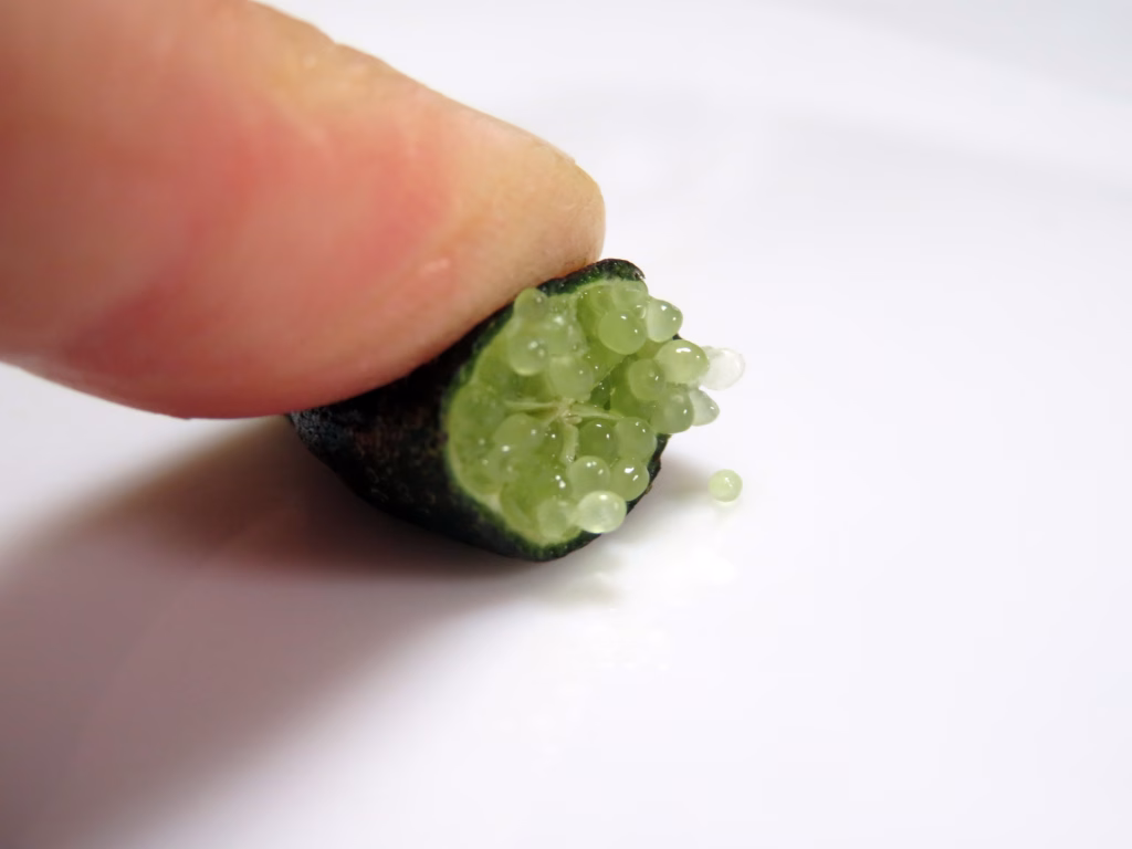フィンガー・ライム (Tucker Bush HP 参照)の果実は、果肉がキャビアのみたいな粒々で、色が黄色、ピンク、赤紫などがあるようです。その果肉を使って、夏の冷たいサマードリンクに入れたり、デザートに入れてみたり、果汁を生牡蠣や魚料理やイカ料理などにも使われます。